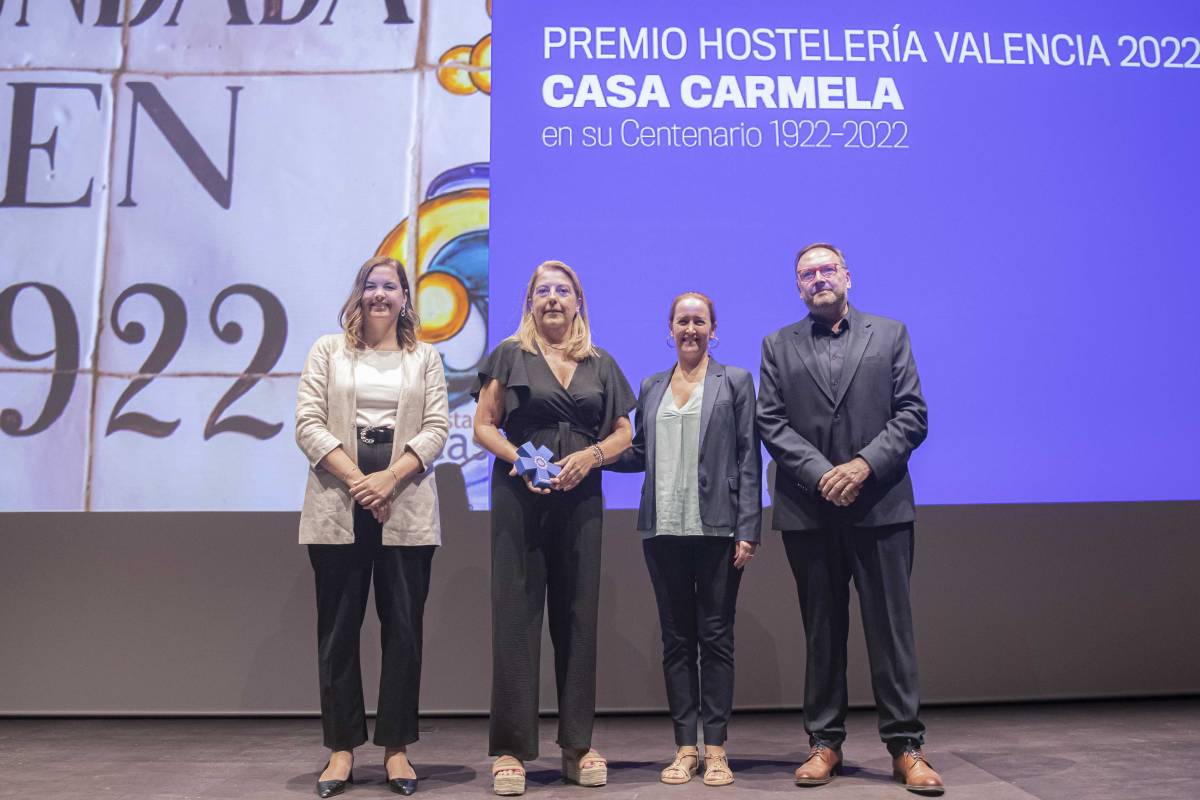 - Mención especial al restaurante Casa Carmela por su Centenario. Cuatro generaciones que han culminado cien años extraordinarios. Desde aquella barraca en los años 20 del siglo pasado que servía de cambiador para los bañistas, fueron evolucionando y hoy la cuarta generación capitaneada por Toni Novo mantiene su cocina centenaria, el sabor ahumado de las paellas a leña de la bisabuela y, en definitiva, lo mejor del mar y de la huerta valencianos con un trato familiar.