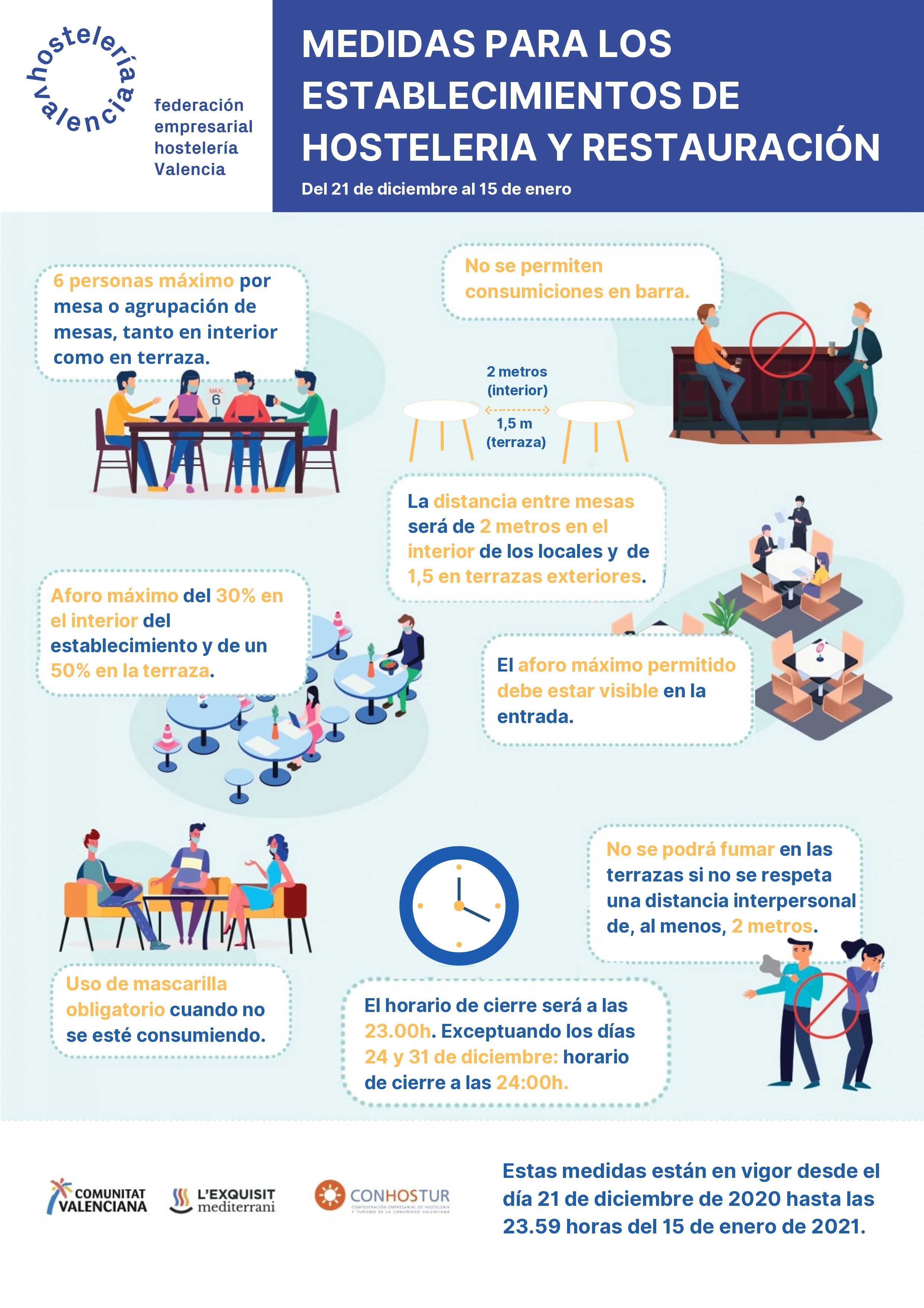 La Resolución de la Consellera de Sanidad Universal y Salud Pública ha publicado NUEVAS MEDIDAS en la Comunitat Valenciana para los establecimientos de hostelería, que se aplican desde el 21 de diciembre de 2020 y que estarán en vigor hasta el 15 de enero de 2021. Son las siguientes: