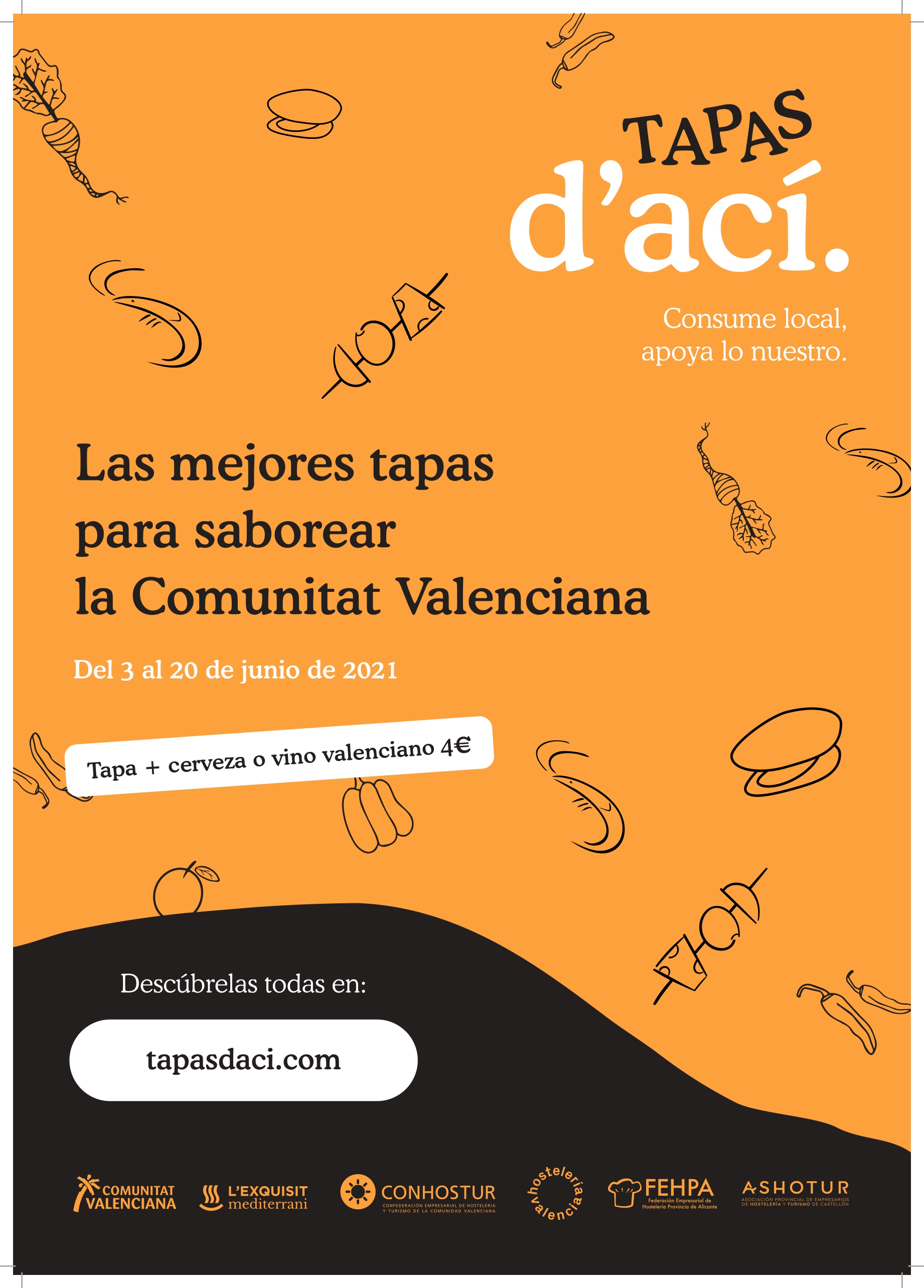 TAPAS D’ACÍ. Bajo este epígrafe se presenta la nueva ruta de tapas valencianas, promovida por la Confederación Empresarial de Hostelería y Turismo de la Comunidad Valenciana (CONHOSTUR), Hostelería Valencia y Turisme Comunitat Valenciana. Dado que el año pasado esta cita gastronómica no pudo celebrarse debido a la pandemia, en 2021 regresa con más fuerza y diversidad que nunca, incluyendo por primera vez a los establecimientos de la provincia de Castellón y sumando un total de 75 locales participantes. Las fechas que comprenderá la propuesta serán del 3 al 20 de junio, con una fecha clave entre ellas, el 17 de junio, Día Mundial de la Tapa.