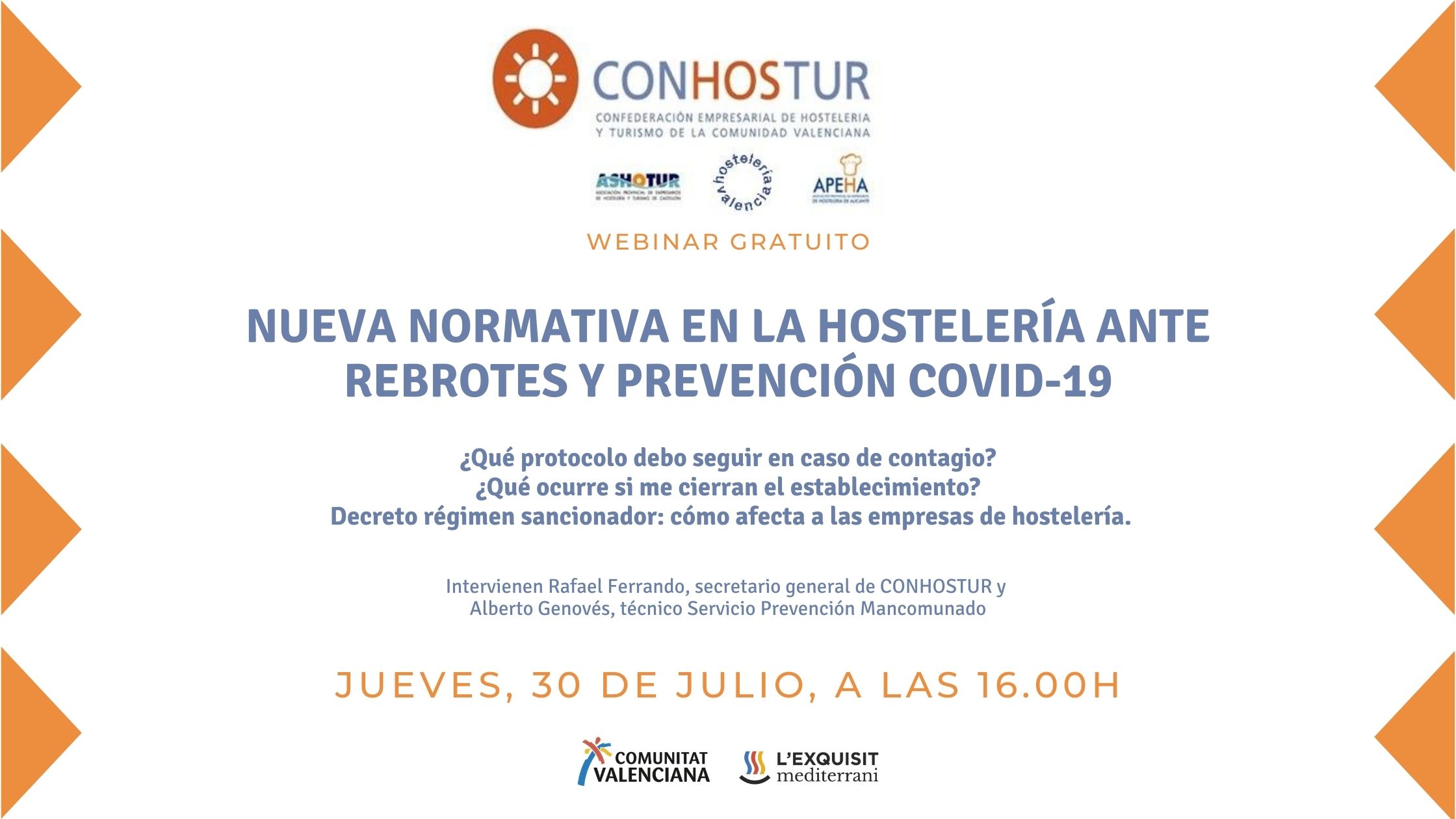 El jueves, 30 de julio, la Confederación Empresarial de Hostelería y Turismo de la Comunidad Valenciana (CONHOSTUR) organizó un nuevo webinar para informar a los profesionales y empresarios del sector sobre la nueva normativa en la hostelería ante rebrotes y prevención COVID-19.